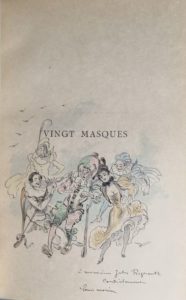 MORIN (Louis). - VAUCAIRE (Maurice). Vingt masques. Paris, Rouquette, [1895]. In-8, maroquin fauve, janséniste, dentelle intérieure dorée, tête dorée, couverture et dos (Bretault). Exemplaire enrichi d UNE AQUARELLE ORIGINALE sur le faux-titre et d une suite en noir sur chine. On a relié à la suite un second exemplaire en noir, non justifié, le tout sous une seule couverture, imprimée en trois états.