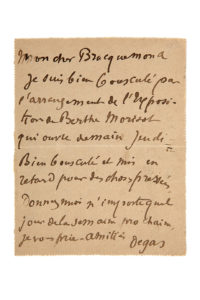 "Je suis bien bousculé par l'arrangement de l'Exposition de Berthe Morisot qui ouvre demain jeudi. Bien bousculé et mis en retard pour des choses pressées. Donnez-moi n'importe quel jour de la semaine prochaine, je vous prie. Amitiés, Degas".