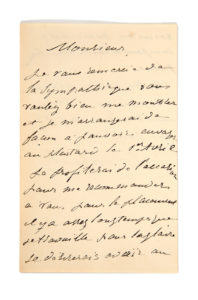 "Monsieur, je vous remercie de la sympathie que vous vous voulez bien me montrer et je m'arrangerai de façon à pouvoir renvoyer au plus tard le 1er avril. Je profiterai de l'occasion pour me recommander à vous pour le placement. il y a assez longtems que je travaille pour le faire. Je désirerai avoir au moins cette compensation : une bonne place (de sa photo)......"