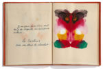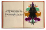 ♦ Superbe manuscrit poétique illustré de 9 gouaches, formant des animaux imaginaires en forme de tests de Rorschach, avec en regard les vers de Michaux tirés de Mes Propriétés (Gallimard, 1929 - repris dans La Nuit Remue en 1935) et d’Animaux fantastiques (Plume, 1938) et écrits par la main d’Éluard.