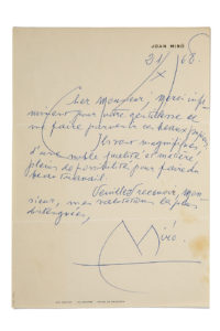 MIRO Joan (1893-1983). — L.A.S. "Miro", [Palma de Majorque, 1968], adressée à Monsieur Fred SIEGENTHALER. — 1 page in-4, en-tête "Joan Miro" (tâches brunes). — Enveloppe d'origine jointe.