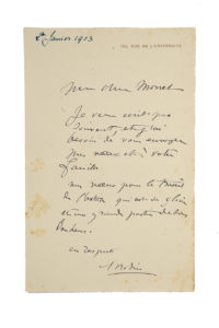 RODIN Auguste (1840-1917). — L.A.S. "A. Rodin", Paris, 2 janvier 1903, adressée à Claude MONET. — 1 page in-8 (pliure, tâches), en-tête "182, rue de l'Université".