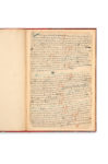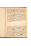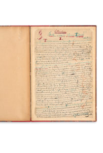 Le manuscrit, superbement tracé aux encres noire, verte et rouge, a été découpé en 47 bandes numérotées au crayon rouge pour en accélérer la composition ; manquent les petits fragments 25, 26, 35, 37, 39 et 40. Il présente quelques ratures et corrections