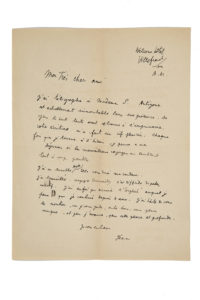 « Mon très cher ami, J'ai télégraphié à Madame S. Antigone est actuellement inmontable sans ma présence. De plus, le seul texte exact se trouve à l'imprimerie. Votre écriture m'a fait un vif plaisir. Chaque fois que je tourne à "l'Indien", je pense à nos déjeuners où les merveilleux voyages me semblent tout à coup possibles. J'ai vu Marthe Hyde. Elle vous dira ma couleur. J'ai travaillé auprès de Stravinsky, c'est difficile de rester inactif. J'ai enfin pu écrire l' "Orphée" auquel je pense et que je combine depuis 4 ans. J'ai hâte de vous le montrer, car je vous garde, entre tous, une place unique - et plus j'avance, plus cette place est profonde. Je vous embrasse. Jean. »