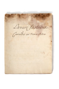 COYPEL, Charles-Antoine (1694-1752), peintre, graveur et auteur dramatique. — Manuscrit complet de la pièce "L'Avare fastueux - Comédie en trois actes". — 94 pp. in-4. 4 pp. d'une main différente. — Mouillures en tête avec manques de papier.