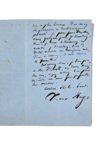 HUGO Victor (1802-1885). — L.A.S. « Victor Hugo », H.H. [Hauteville House] 25 juin [1865 ?], à Eugène RASCOL ; 2 pages in-8 sur papier bleu. — Contre la peine de mort.
