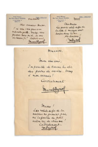 PAGNOL Marcel (1895-1974).— Ensemble d'une L.A.S, de trois cartes autographes signées dont 2 avec entête de la "Société Nouvelle des Films Marcel Pagnol" (sous marie-louise).