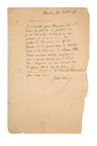 VERNE Jules (1828-1905). — L.A.S. "Jules Verne", Amiens, 24 juillet 1899, adressée à Philippe GILLE. — 1 demi page in-8 (fendue, une marge effrangée), enveloppe d'origine jointe (cachet de La Poste).