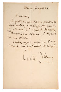 ZOLA Émile (1840-1902). — L.A.S. « Émile Zola », Médan 8 avril 1902 ; ¾ page in-8.