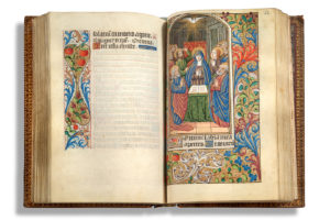 - f. 13 : Saint Jean (Péricopes évang.) - f. 24 : Annonciation (Vierge, Matines) - f. 33 : Visitation (Vierge, Laudes) - f.46 : Annonce aux bergers avec femme en prière (Vierge, Tierce) - f.48v : Adoration des mages (Vierge, Sexte) - f.51 : Circoncision (Vierge, None) - f.53v : Fuite en Egypte (Vierge, Vêpres) - f.59 : Crucifixion (Croix) - f.62 : Pentecôte (Esprit) - f.65 : David en pénitence (Psaumes) - f.79 : Office funèbre (Morts) - f.101 : Douce Dame priée par une bourgeoise anonyme (commanditaire féminine ?).