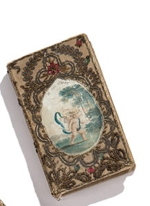 Jolie reliure de l'époque en soie brodée, ornée de deux miniatures à sujets galants, la première représentant un angelot coiffé d'un chapeau et tenant un bâton, surmontée de l'inscription : « Je suis égaré », la seconde figurant un angelot armé d'un arc et d'un carquois pointant vers le plastron d'une armure, accompagnée de la légende : « Rien ne résiste à mes coups ».