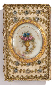 Reliure de l'époque en soie ivoire brodée de fils d'or et d'argent et de sequins, et ornée, au centre de chaque plat, d'un médaillon sous verre bombé serti d'un galon métallique doré : celui du premier plat représentant un bouquet de fleurs dans un vase surmonté de l'inscription « Je vous l'offre pour étrenne », celui du second plat orné d'une guirlande florale et de volutes pailletées contenant les mots « gage d'amitié », tranches dorées, miroir encastré dans le premier contreplat, gardes de tabis rose, pochette à soufflet dans le second plat.