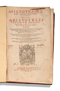 Premier volume seul (sur deux). Il contient : Vita, Categoriae, De interpretatione, Topica, vari trattati sugli animali, De Sophisticis, Phisicae auscultationes, De Caelo, Metereologicorum libri, De mundo, De anima, De sensu, De memoria, De somno, De longitudine et brevitate vitae, De spiritu, Quaestiones mecanichae, etc.