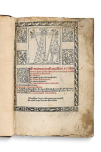 Édition gothique imprimé sur deux colonnes, illustré de nombreuses lettrines ornées ou illustrées gravées sur bois. Le titre, imprimé en rouge et noir, est placé dans un encadrement gravé sur bois.