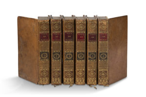 Plein veau brun moucheté, filets d'encadrement estampés sur les plats, dos lisse ornés, pièces de titre et de tomaison de maroquin rouge et noir, roulettes sur les coupes, tranches marbrées, signets conservés (reliures d'époque).
