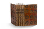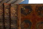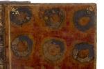 Plein veau porphyre, triple filet doré sur les plats avec fleurons d’angle encadrant 12 cercles à froid, dos à nerfs orné de fers et fleurons dorés, pièces de titre et de tomaison de maroquin brun, double filet doré sur les coupes, roulette intérieure dorée, tranches dorées, gardes de papier bleu (reliure d’époque).