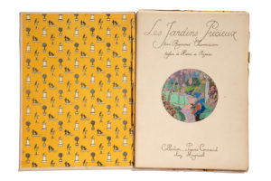 CHARMAISON, Raymond. — Les Jardins précieux. — Préface de Henri de Régnier. — [Paris] : Meynial, collection Pierre Corrard, 5 novembre 1919. — In-folio, (2) feuillets, 8 pages, (2) feuillets et 8 planches coloriées.