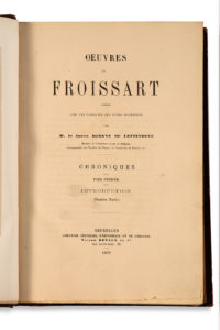 FROISSART (Jean). — Œuvres, publiées avec les variantes des divers manuscrits par le Baron Kervyn de Lettenhove. — Bruxelles : Victor Devaux et cie, 1867-1877. — 25 tomes en 30 volumes in-8, demi-basane aubergine de l'époque, dos lisses...