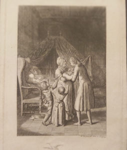 Daniel CHODOWIECKI (1726-1801) — Deux scènes : personnages ou nouveau né présenté à son père. — Eau-forte. — Belles épreuves. Cadres. — 11,2 x 6,5cm. 14,5 x 9cm.