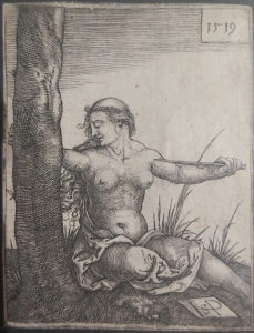 Hans Sebald BEHAM (1500-1550) — Lucrèce. — Burin. — Belle épreuve coupée sur le trait carré, en partie collée, un peu usée. — Cadre. — 5,7 x 4,3cm. — (Hollstein 56)