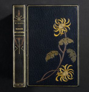LOTI (Pierre). Madame Chrysanthème. Paris, Édouard Guillaume, Éditeur, 1888. In-12, maroquin bleu nuit, filet doré encadrant les plats, décor floral mosaïqué ornant le premier, dos lisse orné de même, tête dorée, étui (Ch. de Samblanx 1910).