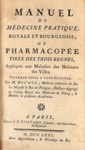 BUC'HOZ (Pierre-Joseph). MANUEL DE MEDECINE PRATIQUE, royale et bourgeoise ou Pharmacopée tirée des trois règnes appliquée aux maladies des habitants des villes. Paris, J. P. Costard, 1771. In-12 de 24-496 pages, demi basane racinée, dos à nerfs orné (reliure de l'époque).