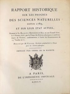 CUVIER (Georges). RAPPORT SUR LES PROGRES DES SCIENCES NATURELLES depuis 1789, et sur leur état actuel. Présenté à sa Majesté l'Empereur et Roi, en son Conseil d'état, le 6 Février 1808, par la Classe des Sciences physiques et mathématiques de l'Institut, conformément à l'arrêté du Gouvernement du 13 Ventôse an X. Paris, Imprimerie Impériale, 1810. In-4° de 16-299 pages, brochage de l'époque.