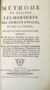ENAUX - CHAUSSIER. MÉTHODE DE TRAITER LES MORSURES DES ANIMAUX ENRAGÉS, ET DE LA VIPÈRE, suivie d'un précis sur la pustule maligne. Dijon, Defay, imprimeur du Prince de Condé, 1785. In-12 de 46-275 pages, demi-maroquin rouge, dos lisse orné (reliure de l'époque).