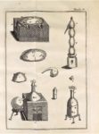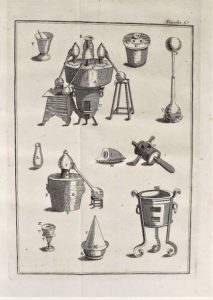 Edition illustrée d'une jolie vignette en tête représentant un laboratoire de chimie, de 9 planches repliées et gravées dont 2 donnant l'explication des plus communs caractères chymiques. Contient aussi de nombreuses recettes de parfums et de liqueur. Une coiffe manquante, petites épidermures sur un plat. (Dorbon, 2601).