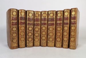 Petite galerie sur un plat, qq. cahiers brunis, sinon bon exemplaire dans une reliure uniforme de l'époque. Les 4 premiers volumes sont datés de 1764, les autres de 1755.