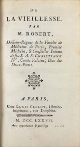 ROBERT (Marin). DE LA VIEILLESSE. Paris, Cellot, 1777. In-12 de 24-442-[2] pages, basane fauve, …