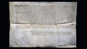 METZ – Hôpital St-Nicolas – 1464 Le 20 mai 1464, signature d’un bail d’une ferme de Baroche moyennant 42 quartiers d’avoine au profit de l’hôpital Saint-Nicolas. Parchemin de 28 x 42 cm. de 33 lignes avec une jolie signature....