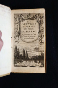 BALZAC (Jean-Louis GUEZ, seigneur de) – Les Œuvres diverses du sieur de Balzac. Augmentées en cette édition de plusieurs pièces nouvelles. À Leide, chez Jean Elsevier 1658, in-24 (14 x 7,8 cm.) de 8 ff.n.ch.- 388 pp. avec un titre frontispice...