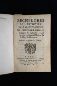 [CHÂTEAU-LANDON] — Recherches de l’antiquité de la ville et baillage de Chasteau-Landon, servant de Deffenses contre les entreprises des Officiers du baillage de Nemours. Réduites en forme de Factum. Paris, Thomas Charpentier 1662, in-8°...
