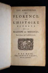 VARILLAS (Antoine) – Les Anecdotes de Florence, ou l’histoire secrète de la maison de Médicis. La Haye, Arnout Leers 1685, in-12 (16,3 x 10 cm.) de 1f. [Titre avec marque de l’imprimeur]- 38 pp.n.ch. [Préface]- 323 pp., reliure d’époque...