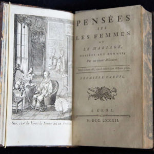 - [FEMME] – [SADE] – Pensées sur les Femmes et le Mariage, dédiées aux hommes ; par un vieux militaire. Première, deuxième et troisième partie. Kehl, sans nom, 1782. Trois parties en un vol. in-12 (17 x 10,5 cm.) de [184 + 199 + 184] pp.,...