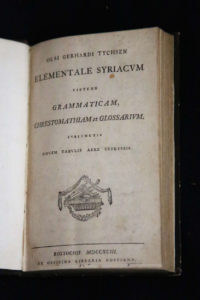 TYCHSEN (Oluf Gerhard) — Elementale Syriacum sistens Grammaticam, Chrestomathiam et Glossarium subiunctis novem tabulis aere expressis. Rostochii [Rostock], ex officina libraria Koppiana [Johann Christian Koppe], 1793. Petit in-8° (17,6 x 11,3...