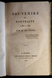 LÉVIS (Pierre-Marc-Gaston, duc de) — Souvenirs et portraits. 1780-1789. Paris, Fr. Buisson 1813. In- 8° (21 x 13,5 cm.) de 2ff.-xxiij-268 pp., reliure strictement d’époque demi-basane, dos lisse à décor de croisillons et fleurons or, pièce...