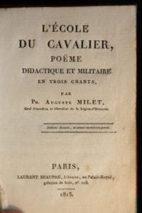 MILET (Ph. Auguste) — L’École du Cavalier, poëme didactique et militaire en trois chants. Paris, de l’imprimerie de D’Hautel, Laurent Beaupré libraire, 1813. Opuscule in-18 (15 x 9,7 cm.) de 72 pp., vignette gravée sur faux-titre. Reliure...