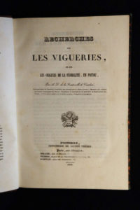 FONTENELLE DE VAUDORÉ (Armand-Désiré DE LA) – Recherches sur les Vigueries, et sur les origines de la Féodalité, en Poitou. Poitiers, Saurin fr. imp., 1839, in-8° (24 x 16,2 cm.) de 165 pp.- 1f., une carte dépliante. Relié demi-chagrin, dos...
