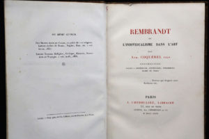 COQUEREL fils [Pasteur Athanase Josué] – Rembrandt et l’individualisme dans l’art. Paris, J. Cherbuliez 1869, in-16 (17,2 x 11,2 cm.) de 3ff.- xv-158 pp.- 1f., relié pleine toile granité marron, dos lisse titré or. Édition originale....