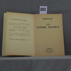 PRINNER (Anton) – La Femme tondue. Paris, APR - 10 rue Pernéty, 1946, in-12 (20 x 13,5 cm.), broché, non paginé, imprimé à compte d’auteur par les soins de François Bernouard, le 25 juillet 1946 à 600 exemplaires numérotés ; celui-ci un...