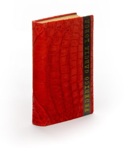 Madrid, Revista de Occidente, 1928. 1 vol. (105 x 155 mm). Peau d’alligator rouge, dos lisse, pièce de titre verticale sur le premier plat en veau brun cuivré, doublures et gardes de suédine noire, couvertures et dos conservés, chemise et étui (A. Devauchelle, 2008).Édition originale dont il n’a pas été tiré de grands papiers (catalogue Les Argonautes, 2002, n° 55). Habile restauration angulaire au dernier feuillet.