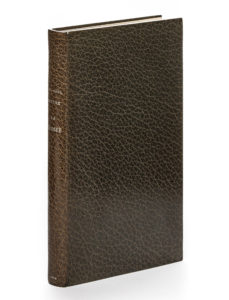 Paris, Gallimard, (5 avril) 1938. 1 vol. (115 x 185 mm). Maroquin taupe, dos lisse, titre à l’œser argent, tranches assorties, doublures ornées d’un encadrement du même maroquin rehaussé de deux filets à l’œser argent et de trois petits filets à froid aux angles, couvertures et dos conservés, étui bordé (Semet & Plumelle).Édition originale. Un des 23 premiers exemplaires sur vélin pur fil (n° 11). Des bibliothèques Louis de Sadeleer, Robert Desprechins (ex-libris) et Jean A. Bonna (ex-libris ; Pierre Bergé, 2017, n° 271).