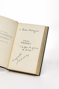 Paris, Plon, (15 octobre) 1951. 1 vol. (135 x 200 mm). Maroquin vert, dos lisse, titre doré, tranches dorées sur témoins, doublures de chèvre velours vert anis, gardes du même velours bordé d’un listel de maroquin vert, couvertures et dos conservés, chemise et étui (J.-P Miguet).Édition originale. Un des 35 premiers exemplaires sur pur fil, celui-ci hors commerce (n° 8). Envoi signé : « à Robert Mainguet, ‘… la force, la justice, les muses…’ Marguerite Yourcenar ». De la bibliothèque Robert Mainguet, alors directeur des éditions Plon. Dos de la chemise passée.