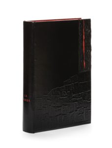 Paris, Gallimard, (30 mars) 1967. 1 vol. (150 x 220 mm). Veau noir, dos lisse, titre à l’œser rouge, décor mosaïqué en relief composé de pièces de veau plissées noir et rouge et d’un estampage à froid sur les plats inférieurs, doublures de cuir fantaisie rouge, gardes de velours rouge, couvertures et dos conservés, chemise et étui (A. Butré, 2016).Édition originale. Un des 40 premiers exemplaires sur vélin de Hollande (n° 17). Prix Goncourt 1967.