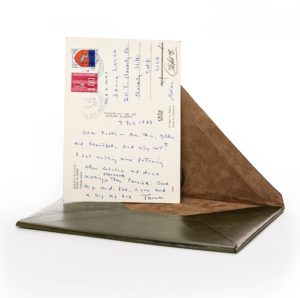 . 1 carte (150 x 105 mm) de 8 l. à l’encre bleue, conservée dans une enveloppe titrée. Adressée à Mr. et Mrs Lazar, datée 3 Feb 1978. Signée Truman. Cachet de la Poste 4-2-78. “Dear Foeks, Am thin, golden and beautiful. And why not? I eat nothing more fattening than lobster and drink nothing stronger than Perrier. Back mid-Feb. Love and a big big hug Truman”