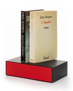 Paris, Grasset, (18 janvier) 1980 et Fayard, (novembre) 1981. 2 vol. (155 x 240 mm). Brochés, chemise et étui (elbel libro).Éditions originales. Envois signés : « Pour Philippe Landman, ce nouveau (et dernier ?) chapitre d’un voyage à travers la mémoire. En toute amitié J. Semprun » ; « Pour Philippe Landman, ce roman-roman, pour changer. Affectueusement J. Semprun ». [AVEC :] La Montagne blanche Paris, Gallimard, (29 janvier) 1986 Broché, chemise et étui (elbel libro). 1 vol. (140 x 205 mm). Édition originale. Envoi signé : « À Philippe et Marie-Thérèse avec toute mon affection J. Semprun ».