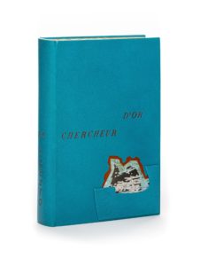Paris, Gallimard, (1er février) 1985. 1 vol. (145 x 215 mm). Box turquoise, dos lisse, titre à l’œser rouge au dos et sur les plats, décor mosaïqué en relief en box et papier sur les plats, tranches dorées sur témoins, doublures de chèvre velours grise, gardes de chèvre velours ocre, couvertures et dos conservés, chemise et étui (Honnelaître, 1996).Édition originale. Un des 45 premiers exemplaires sur vergé de Hollande (n° 5). Envoi signé : « Pour Henri-Michel Tranchimand, pour partager l’or du rêve, avec toute ma pensée cordiale, à Paris, 1er juin 1997, J M G Le Clézio ». De la bibliothèque H.-M. Tranchimand (Artcurial, 2008, n° 82 ; exposition Bibliothèque historique de la ville de Paris, 1996, n° 93).