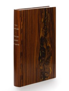 Paris, Gallimard, (4 novembre) 1991. 1 vol. (150 x 215 mm). Reliure à plats rapportés en bois d’olivier, titre à l’œser blanc, tête poncée, plats ornés d’une bande verticale marquetée en loupe de bois rehaussé d’or, gardes de velours beige, couvertures et dos conservés, étui (A. Taral).Édition originale. Un des 50 premiers exemplaires sur vergé de Hollande (n° 33), seul papier.